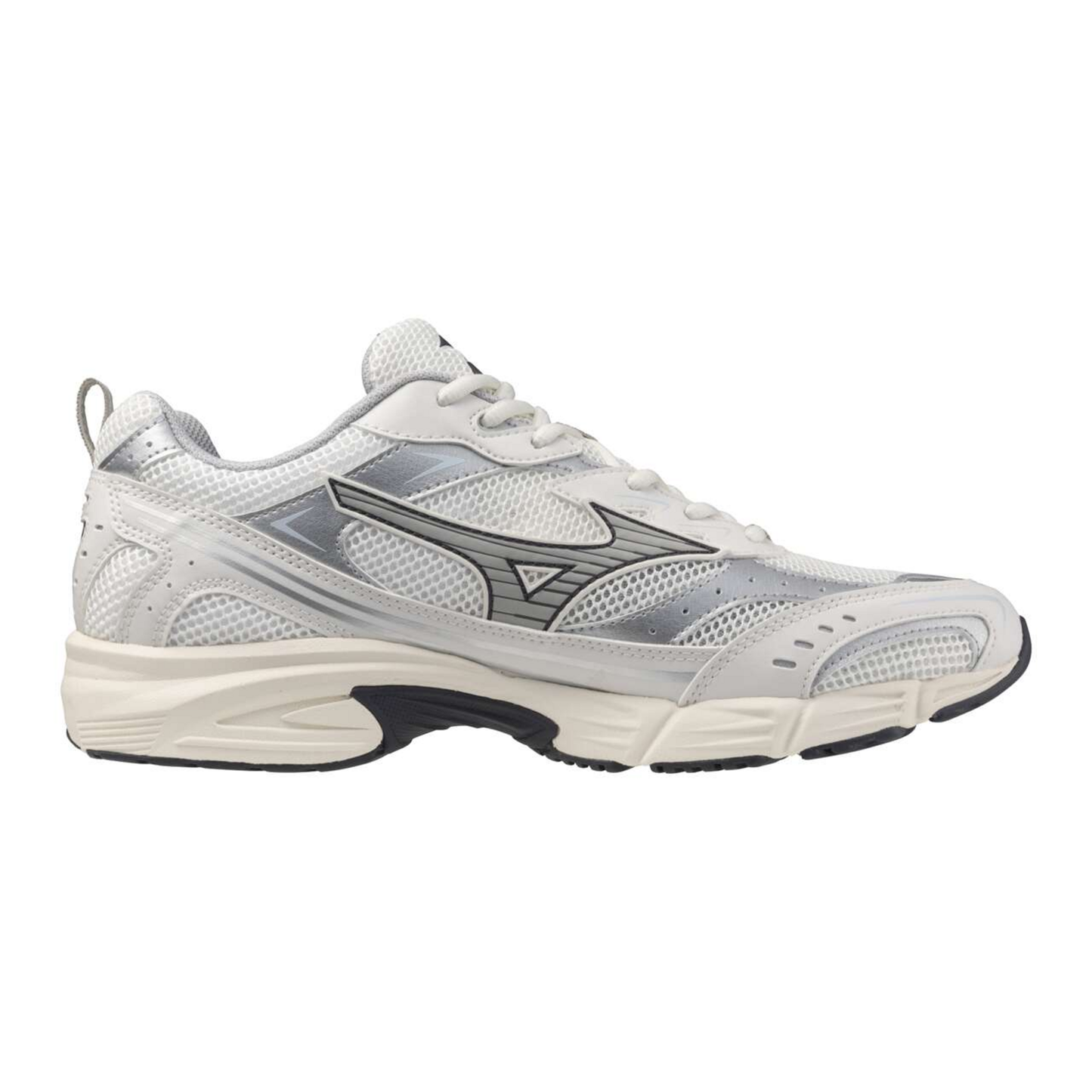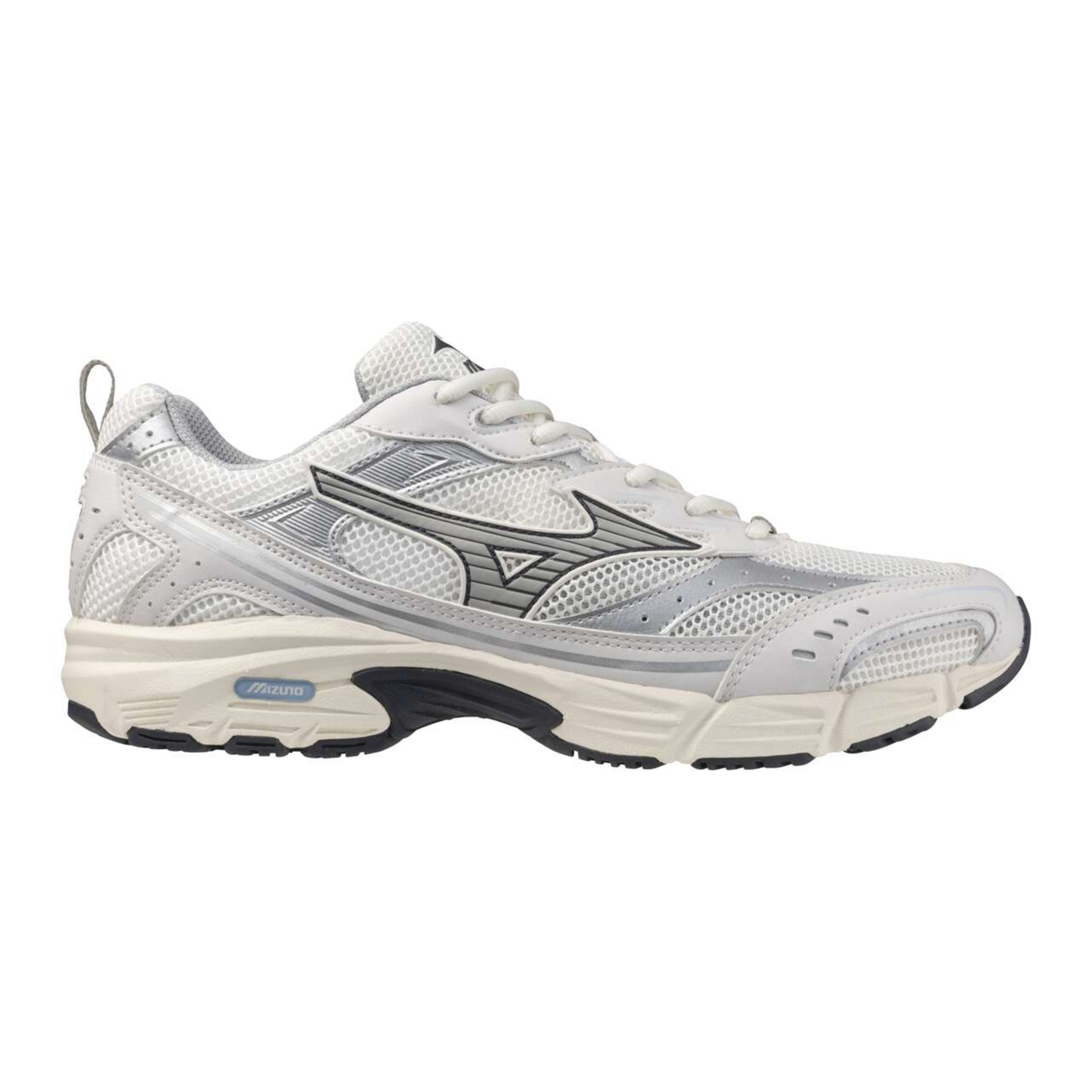 The MXR reflects our desire to spread the Mizuno 2000s retro-running experience, as an extension of the globally recognized Wave Rider 10. The MXR name comes from the Maximizer line, a running line that has been offered for years in our domestic market to deliver Mizuno quality to a wide audience. The MXR is an entry level silhouette, but remain true to the essence of Mizuno, with high level of quality and technicity. A special attention to the new tooling, with a high-level of details and multiple rubber parts that allows technical color blockings. This iteration uses authentic material combination, with silver overlay and white air mesh. The shoe is rich of many detail: eyestay prints, debossed quarters and custom tapes.